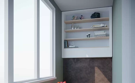Когда не хватает места для напольной мебели, навесной шкаф — идеальное решение для балкона. Он разгружает пол, не мешает проходу и оставляет пространство для сушилки или кресла. Внутри удобно хранить документы, книги, посуду, бытовую химию и наборы для ухода за растениями. Чтобы пользоваться было действительно удобно, заранее определите высоту секций, глубину полок и направление открывания дверец, учтите створки остекления и высоту подоконника.